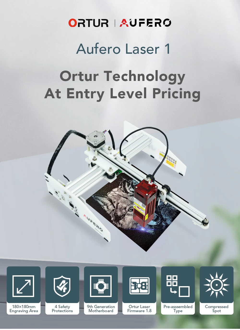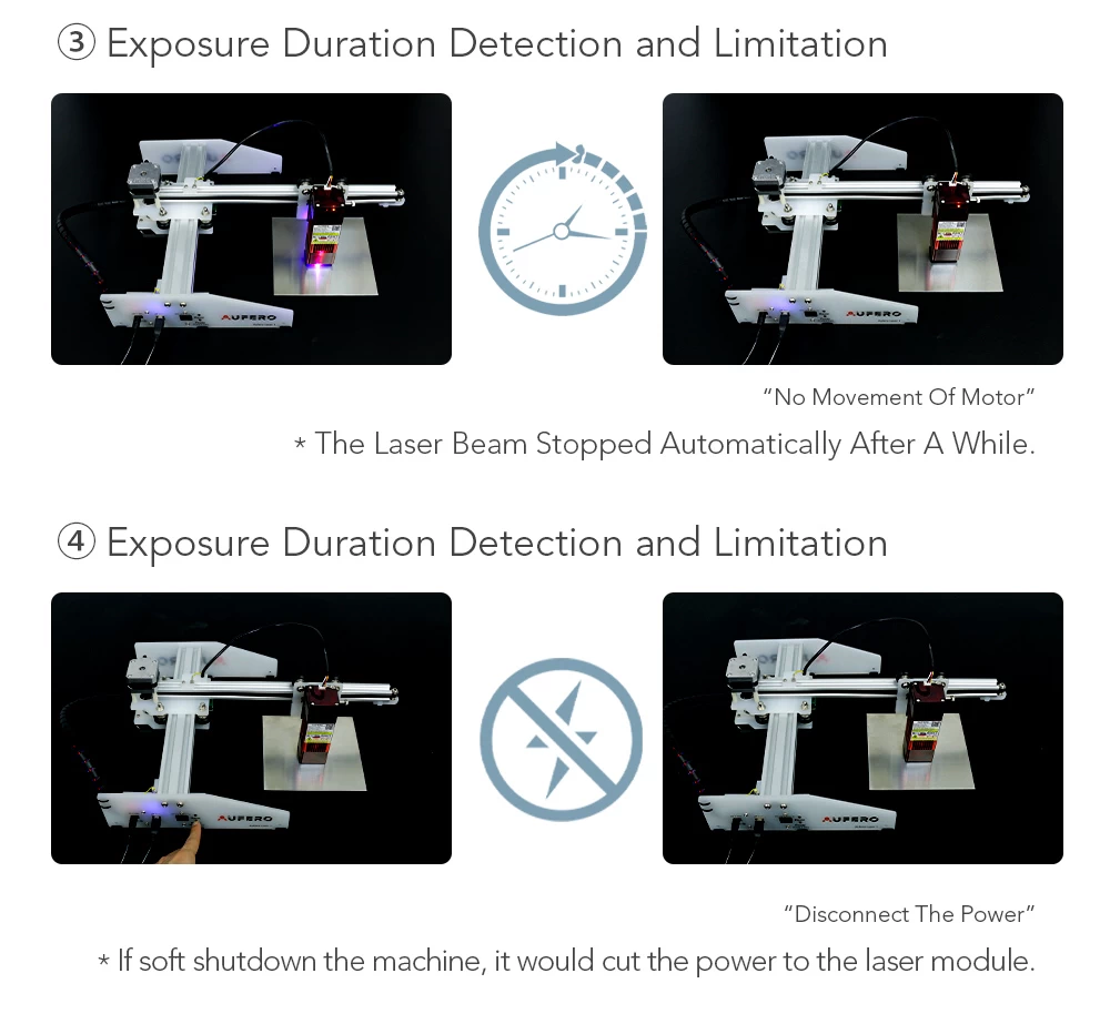 Eye protection design: Aufero Laser 1 with a protective cover perfectly protects our eyes when working. Without wearing goggles, we and the people around us can watch laser engraving.