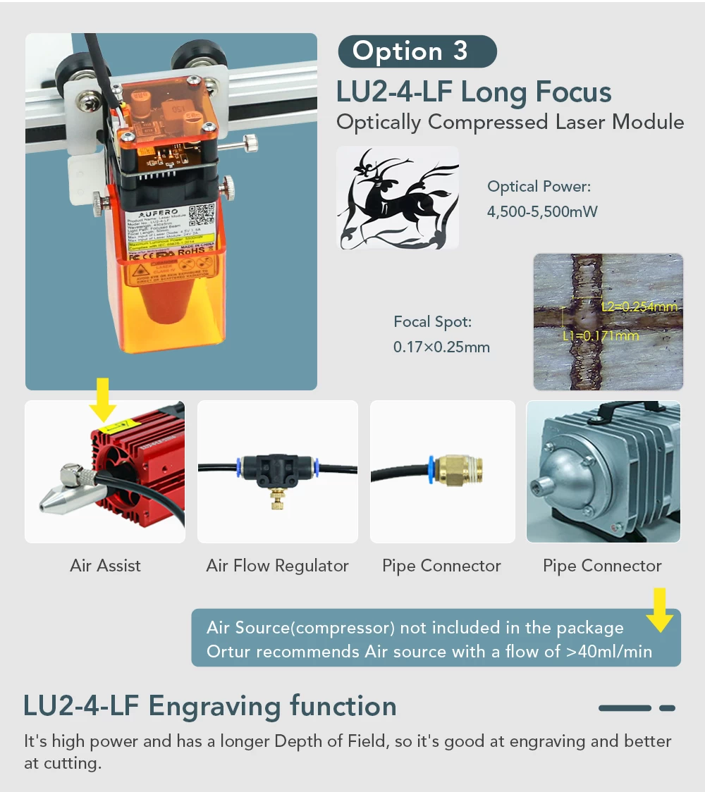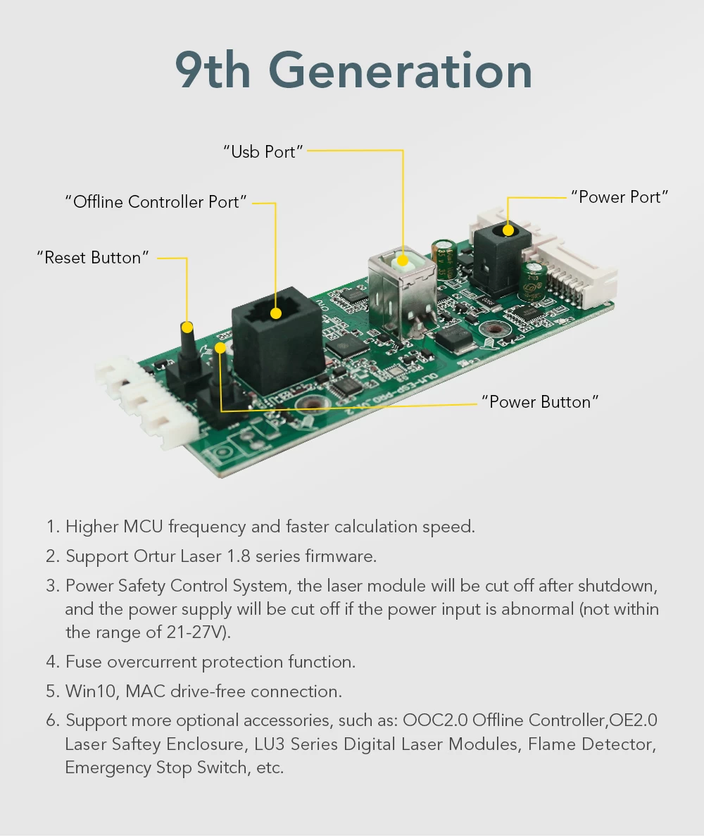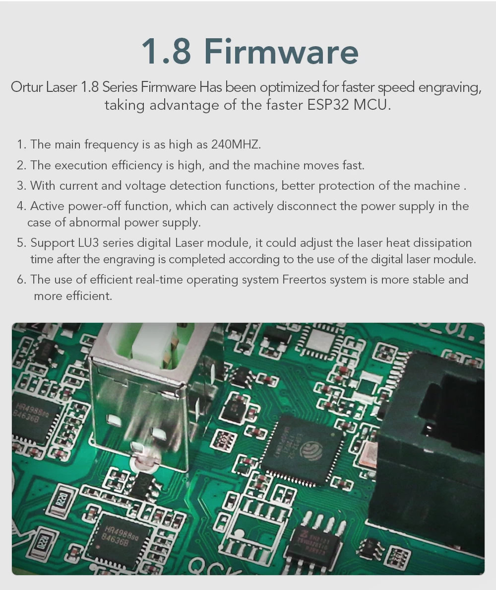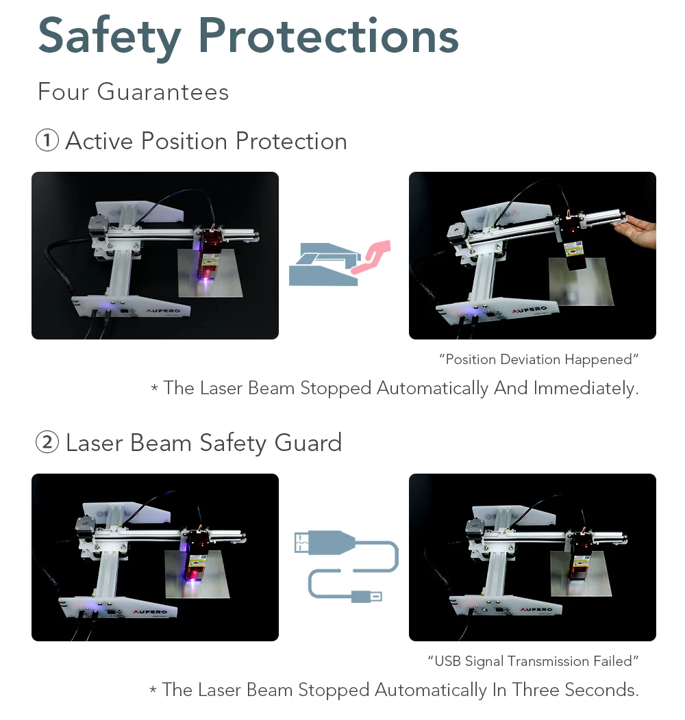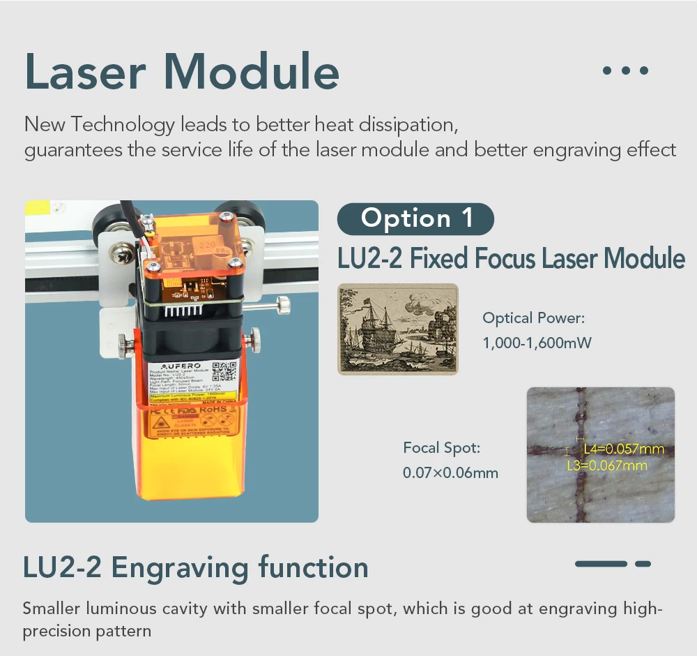 Advanced firmware: Aufero Laser 1 firmware, smarter, faster, more accurate, and easier to use. Professional motherboard with 32-bit MCU. It can preprocess 32 instructions, support up to 921600 baud rate, more powerful. The engraving speed can be as high as 5000mm/min.