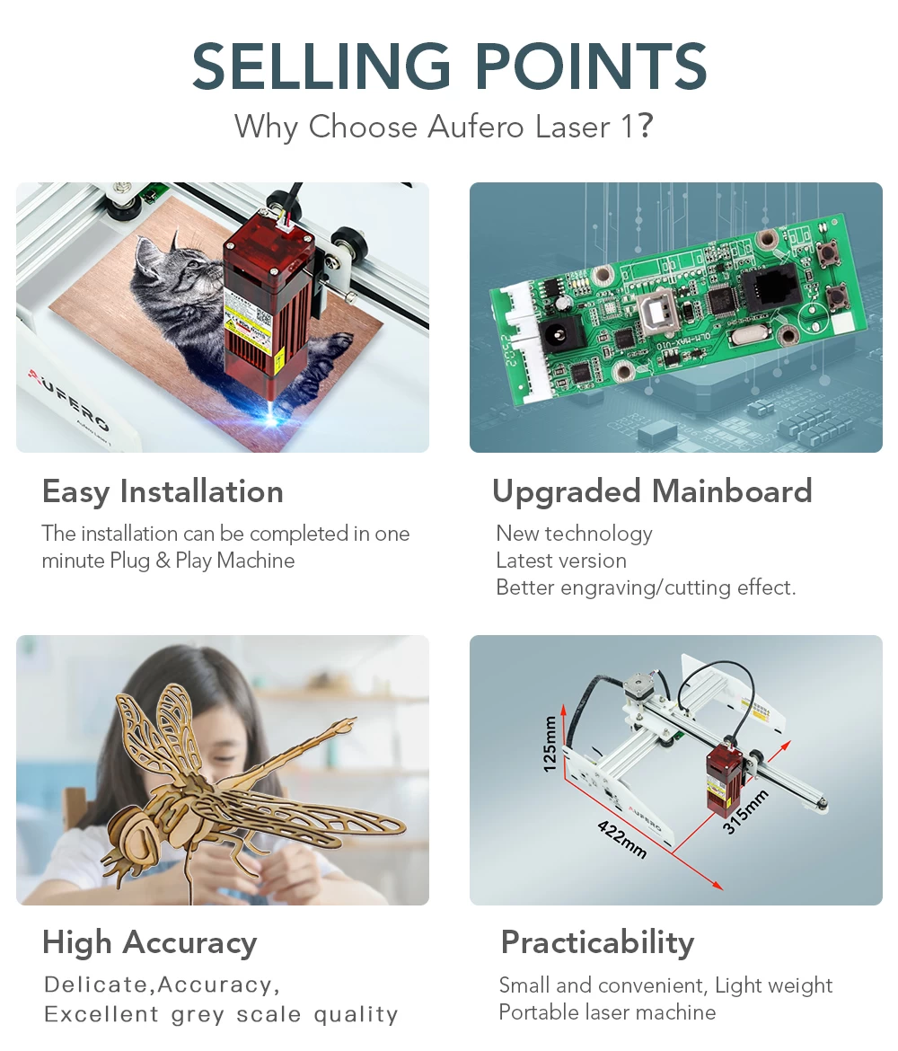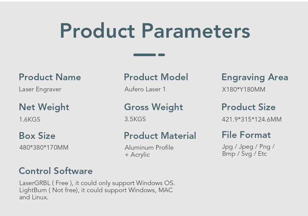 Broad Compatibility: Aufero Laser 1 can be compatible with various mature engraving software, such as LaserGRBL, LightBurn, support Win XP / Win 7 / Win 8 / Win 10, and also support Mac and Linux system (LightBurn, need to be paid), engraving file format supports BMP, JPG, PNG, JPEG, SVG, etc.