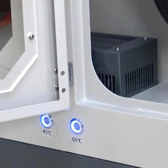 The function is able to dry filaments like Nylon,PC,ABS, which with high water absorption, 45°C and 65°C chamber temperature available.