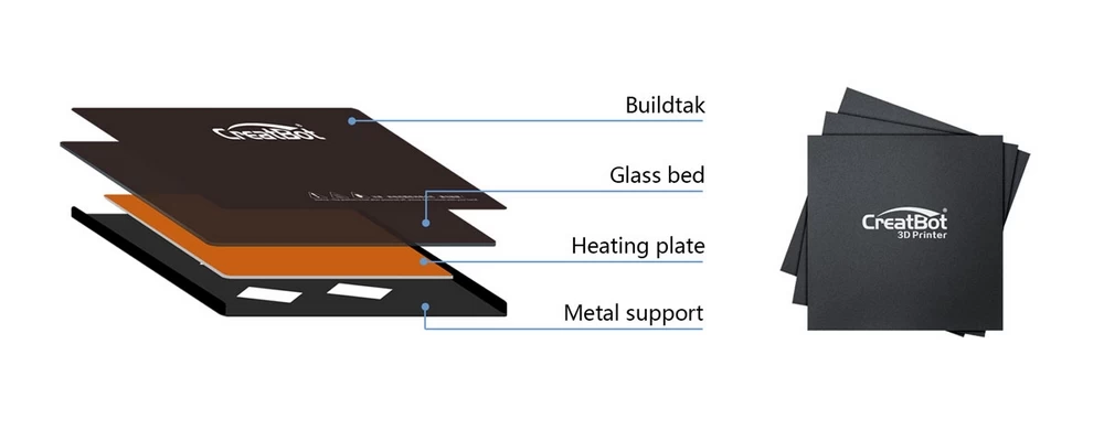 The platform surface is attached with the 3D printing special stickers, and the printer has vertical thermal conductivity so that can support high thermal efficiency. You can set the parameters to turn off the hot bed automatically after the specified number of layers.