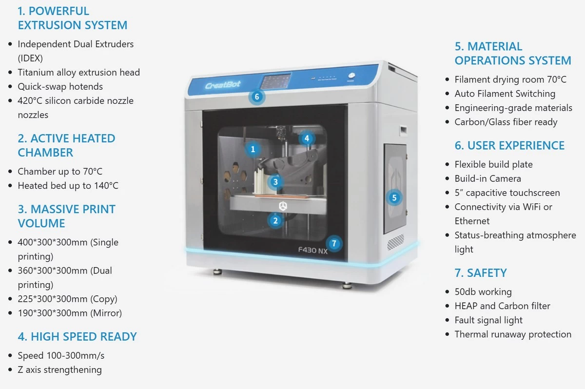 The CreatBot F430 series has established itself as one of the top-selling professional 3D printers, with over 5,000 units sold worldwide. Now, the new CreatBot F430 NX has been introduced, offering an enhanced design and cutting-edge technical innovations. This model delivers exceptional performance with no compromises, making it an ideal choice for professionals seeking reliable, high-performance 3D printing.