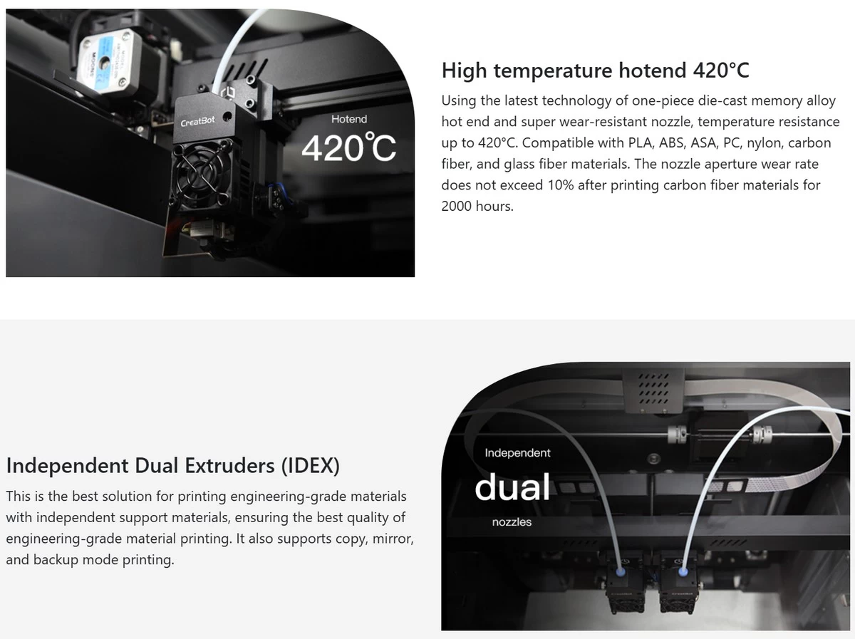 The independent dual-nozzle setup supports multi-material printing with high precision and efficiency, allowing seamless use of advanced filaments.