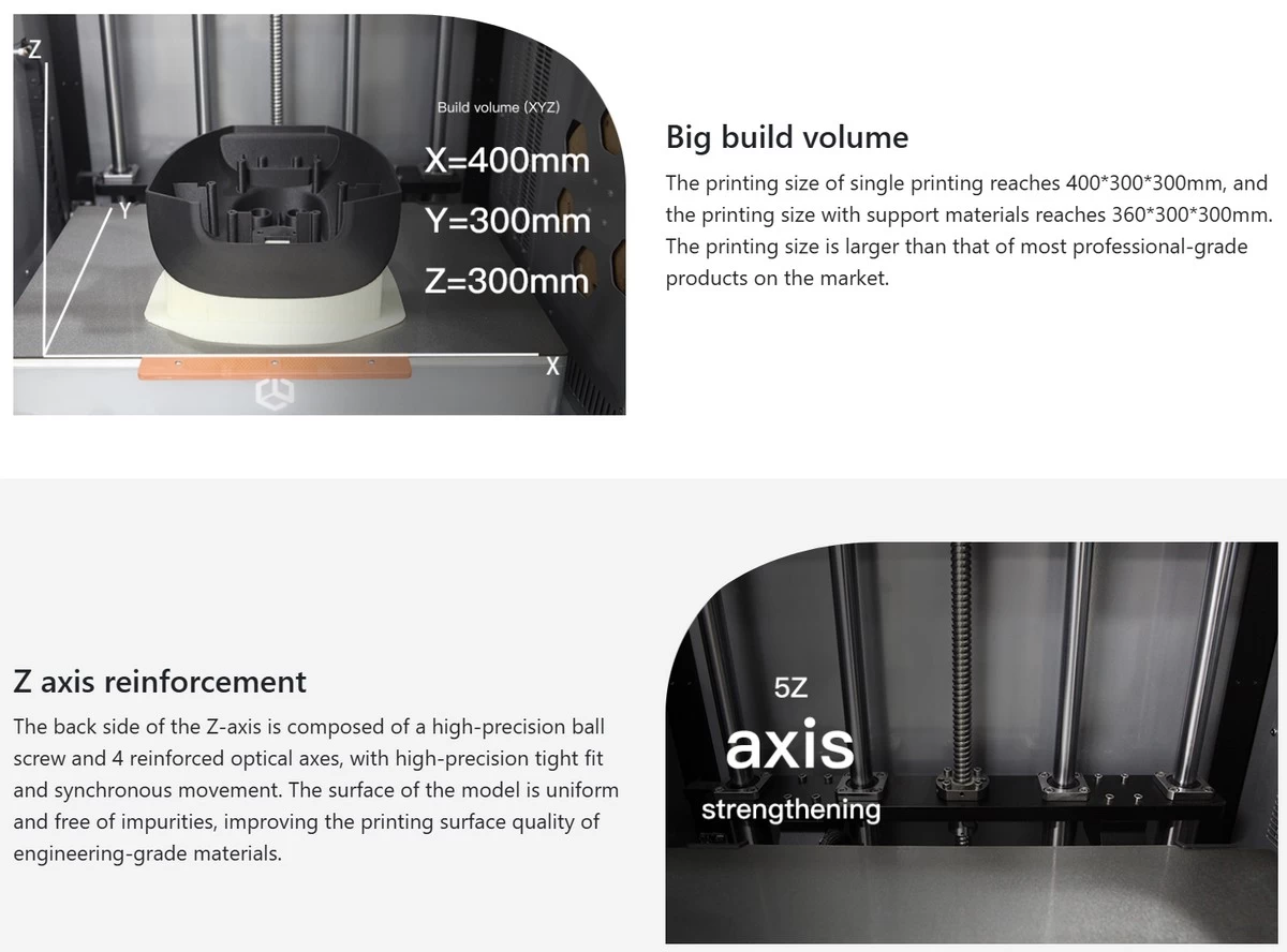 Print size ( X Y Z ) | Single printing: 400*300*300mm Dual printing: 360*300*300mm Copy mode:225*300*300mm Mirror mode:190*300*300mm |
