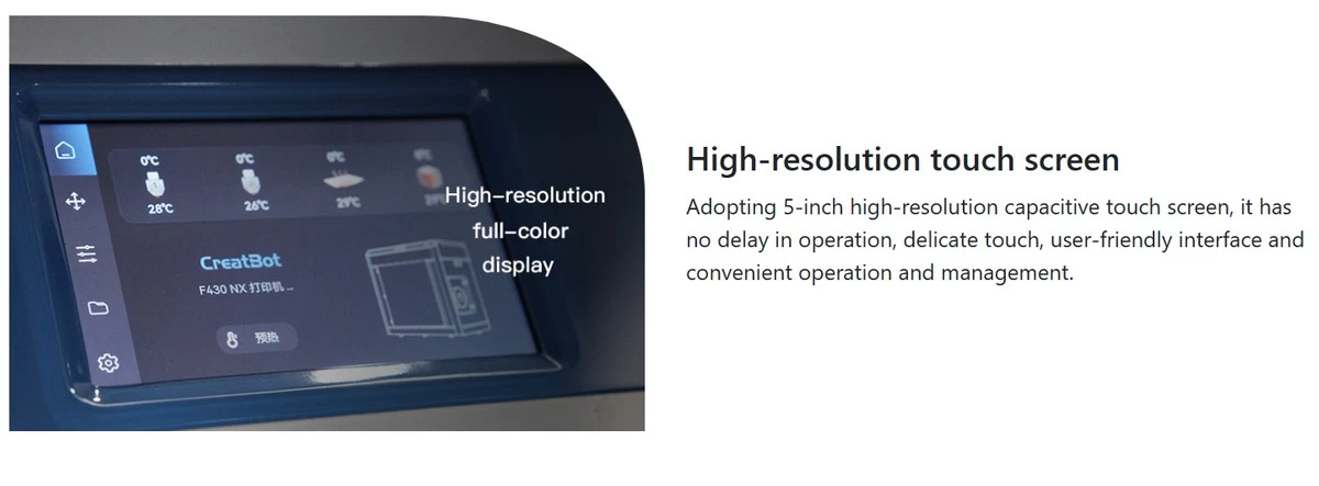 The F430 NX features a sleek, redesigned exterior and a highly durable structural framework built with precision-machined parts. Its independent dual-nozzle with a silicon carbide large-flow extrusion head enables flawless compatibility with high-performance materials and high-speed printing. The user experience is simplified with an intuitive interface, and the printer operates with remarkable stability, ensuring reliable 24/7 performance. In professional applications, the CreatBot F430 NX will be your go-to solution for precise and efficient 3D printing.