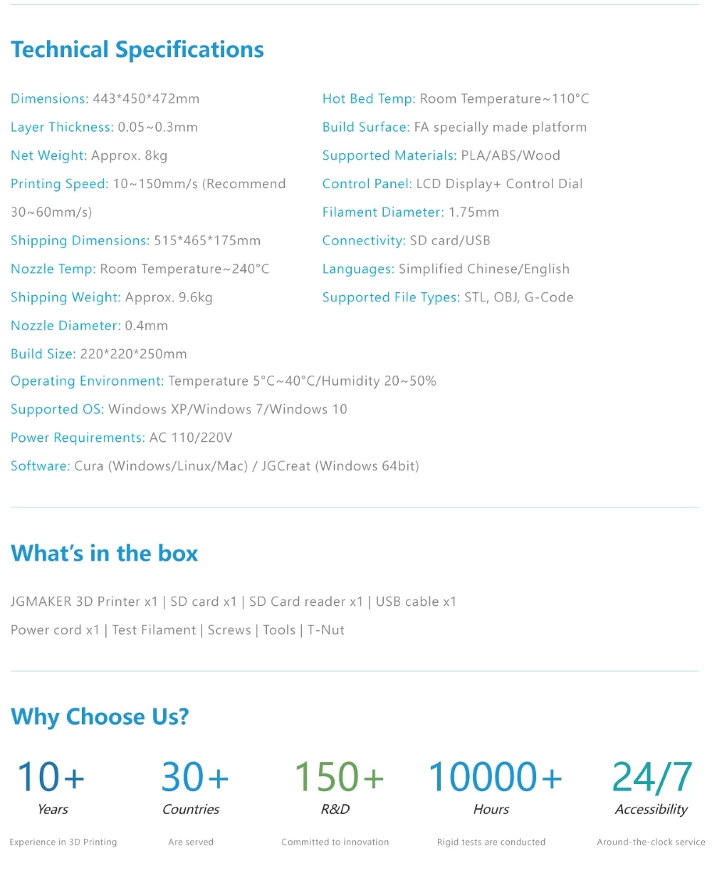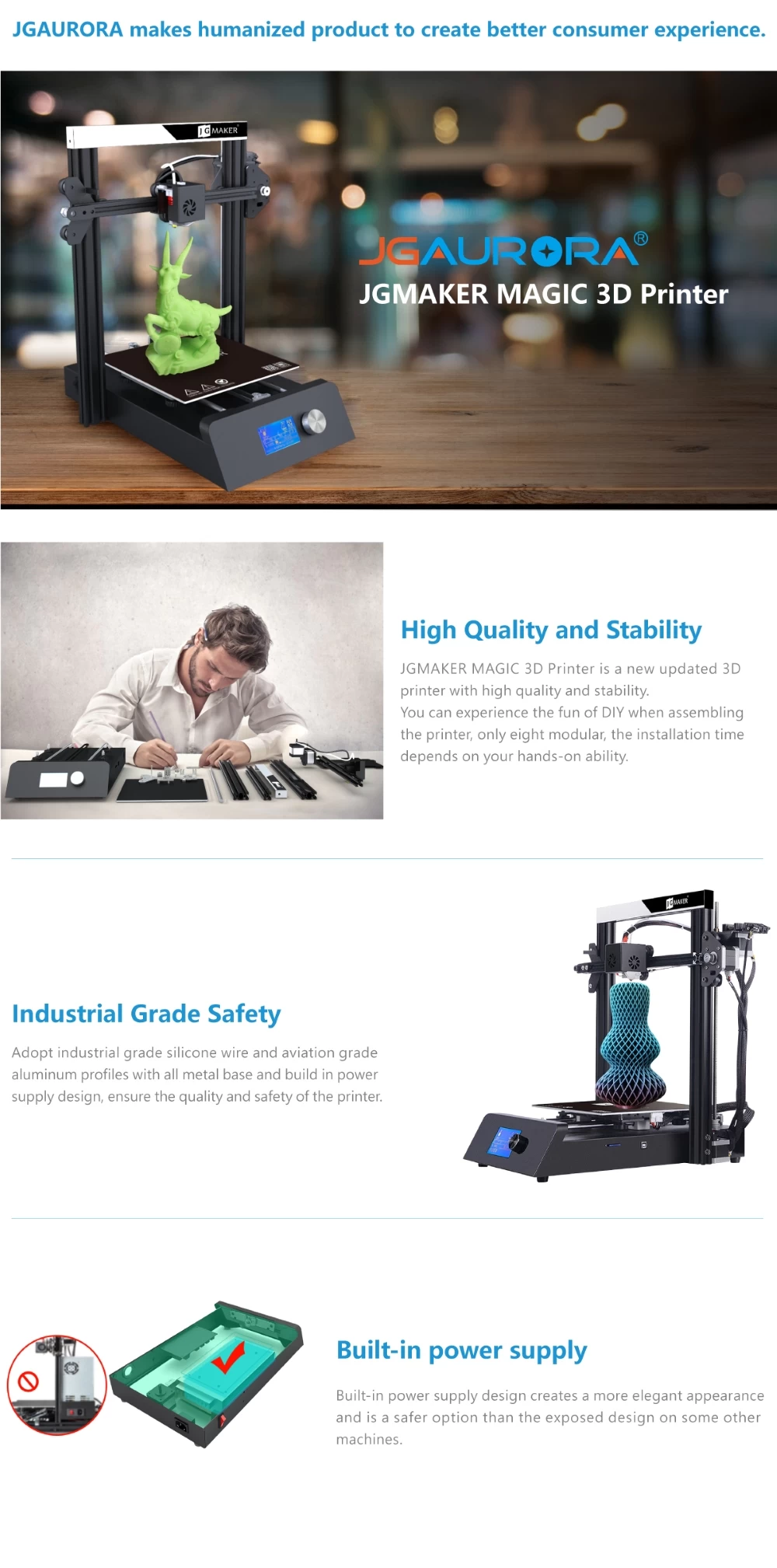 The Jgmaker Magic Desktop Printer is a 3D printer with the imported special aluminum frame. It features with high-precision printing and safe protection function, maintains the garage-built feel and the handmade charms, really helpful for amateurs or professionals, easy to create life-like models from your brain. Magic is also a build-it-yourself kit, which provides you an unforgettable step-by-step learning experience for the 3D printer!
