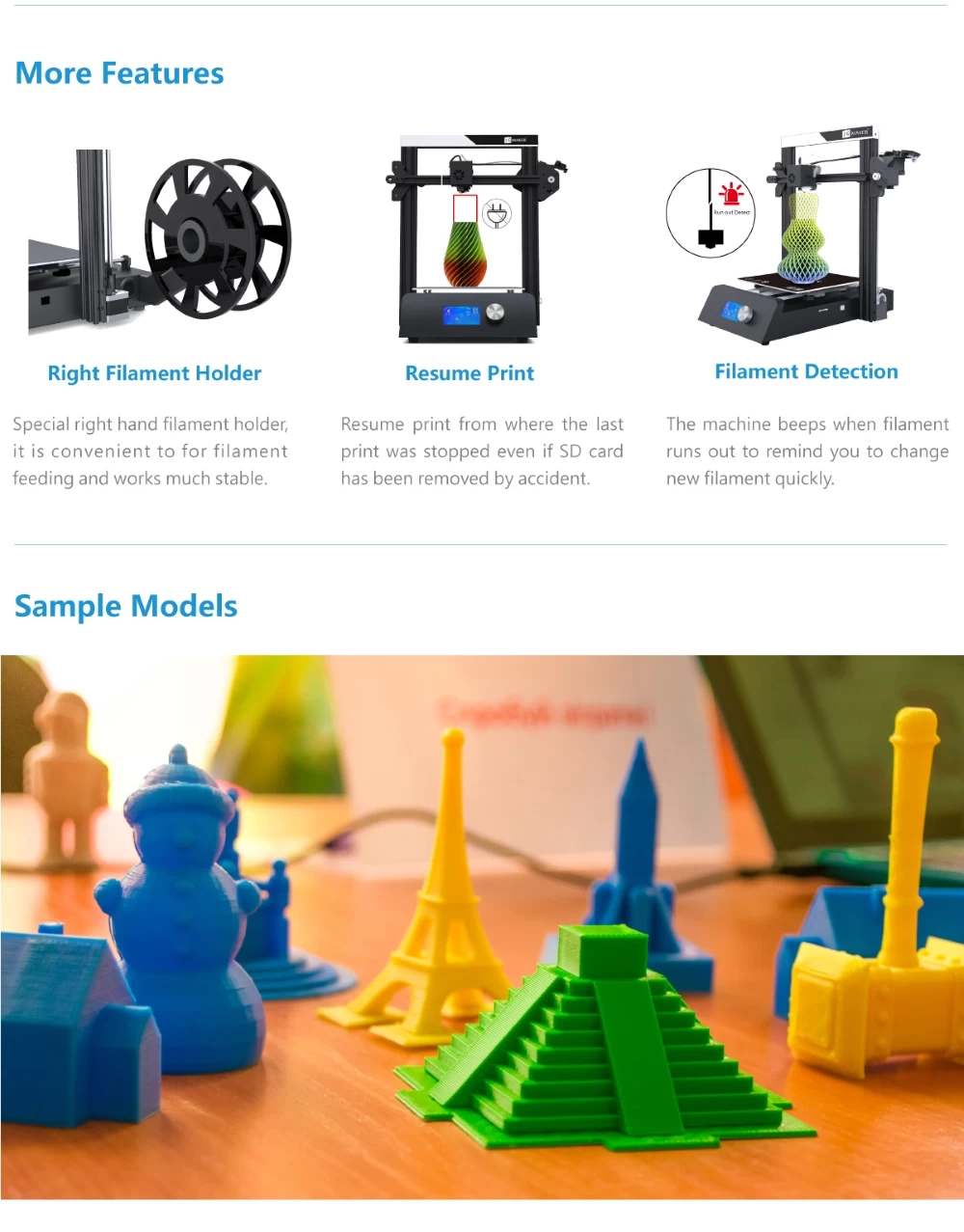 - Filament run out detection and power failure protection, the machine beeps when filament runs out to remind you to change new filament quickly