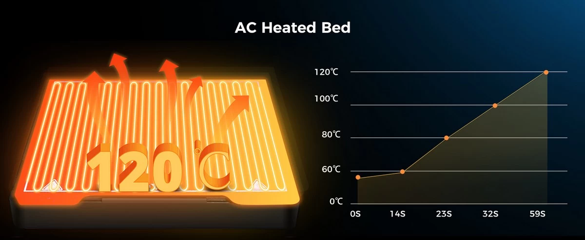 The AC heated bed hits up to 120°C rapidly, significantly reducing wait times and maintaining consistent temperature throughout extended prints. Built-in overheating protection adds another layer of safety.