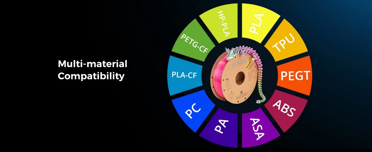 Print with virtually any filament—Sovol Zero’s all-metal nozzle reaches up to 350°C, making it ideal for materials like PLA, TPU, PETG, ABS, ASA, PA, PC, PLA-CF, PETG-CF, and more.