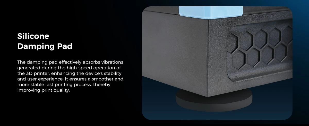 A silicone damping pad absorbs vibrations during high-speed operation, stabilizing the printer and improving overall print quality and user comfort.